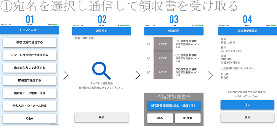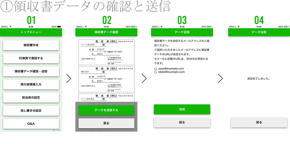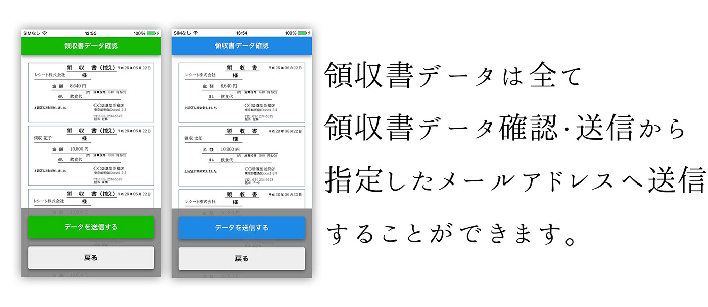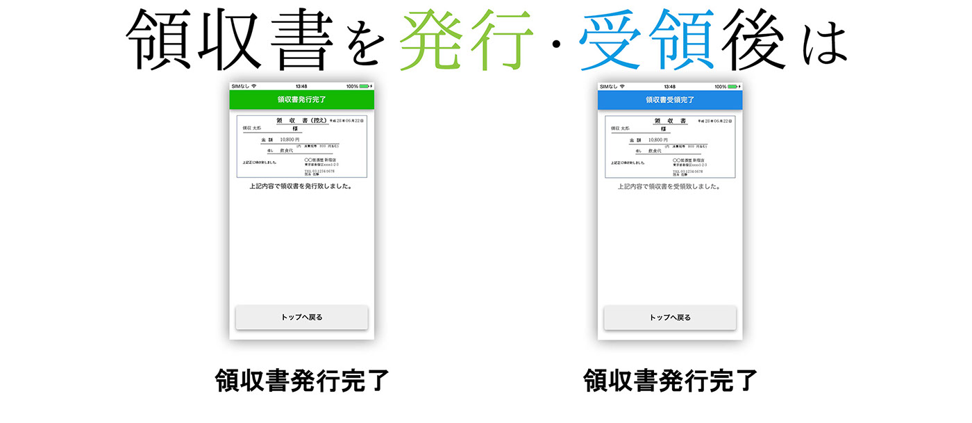 収入印紙不要、切手・郵送代不要、ポスト投函不要といった、今までの常識を覆す画期的な簡易に領収書を発行、受取ができるスマートフォンアプリです。