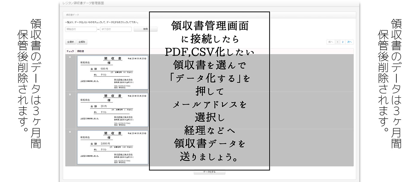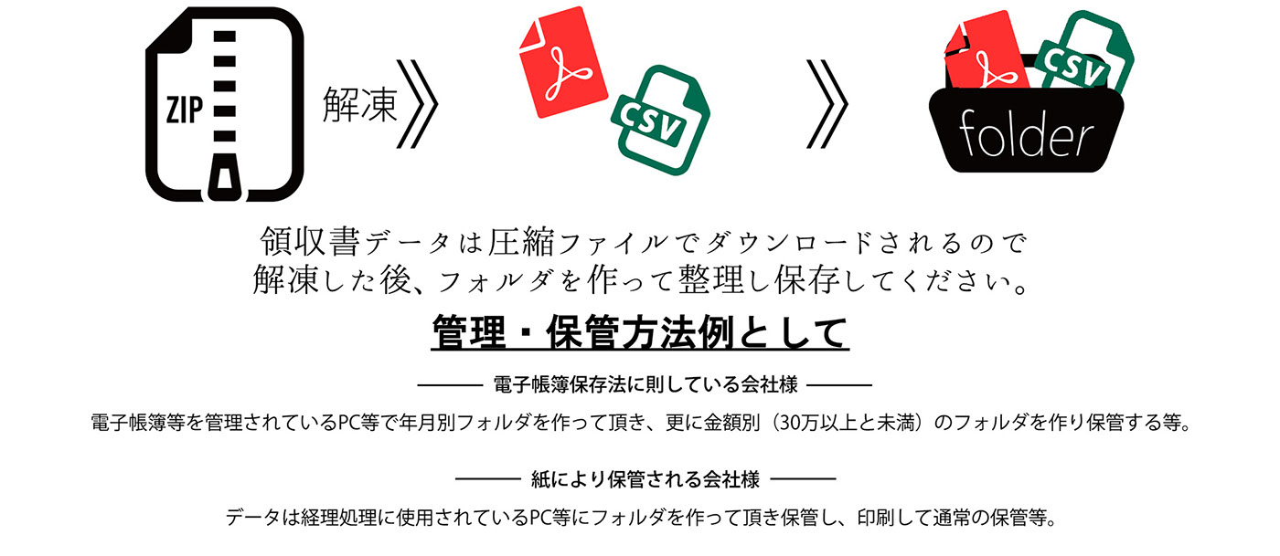 データは経理処理に使用されているPC等にフォルダを作って頂き保管し、印刷して通常の保管等。
