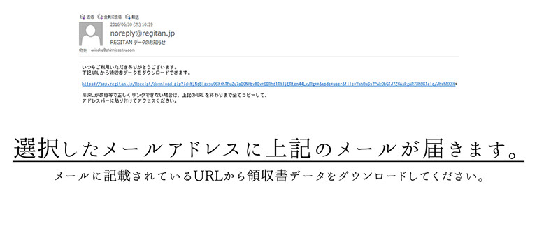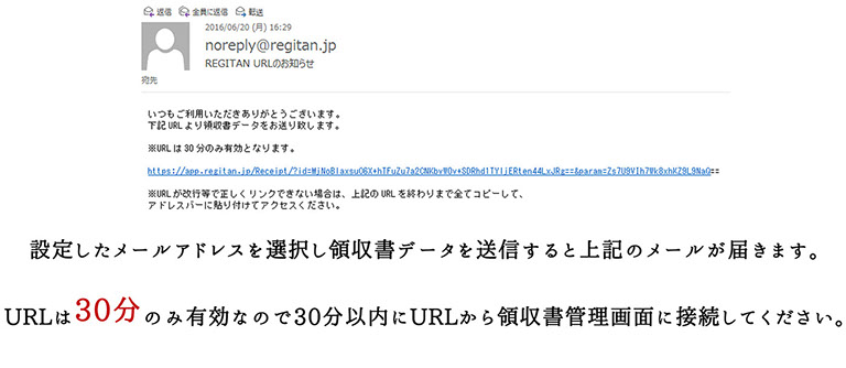 SSL(Secure Sockets Layer)によるデータの暗号化通信を行い、安心・安全で強固なセキュリティーを実現しています。また、送り先へのメール送信は添付ファイルではなく、暗号化されたダウンロードURLを通知する方法のため、URL通知後30分以内にダウンロードをしなければ、領収書はダウンロードできない2重のセキュリティーとなっております。